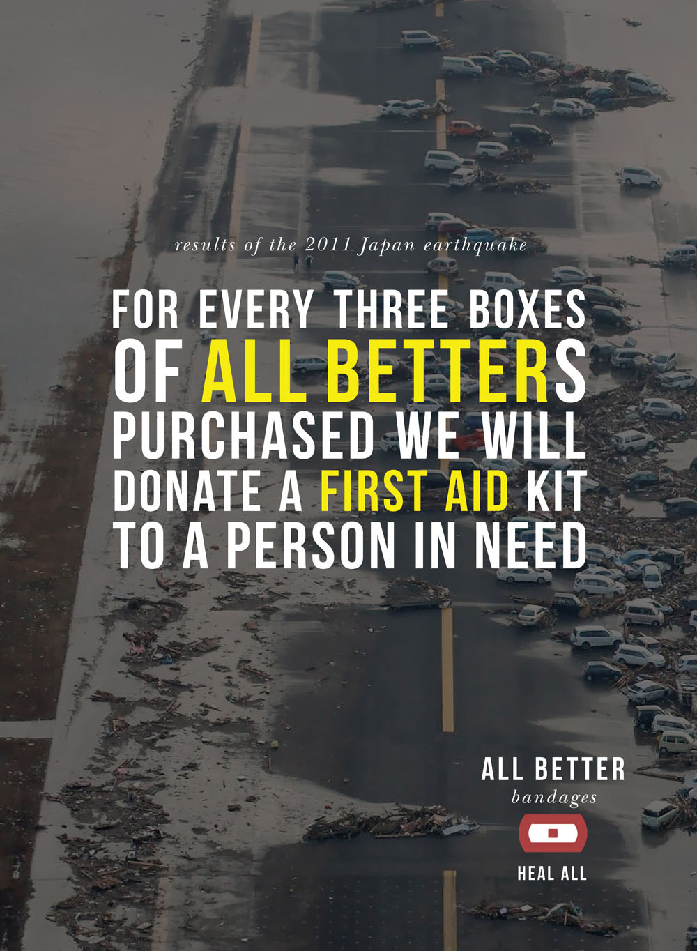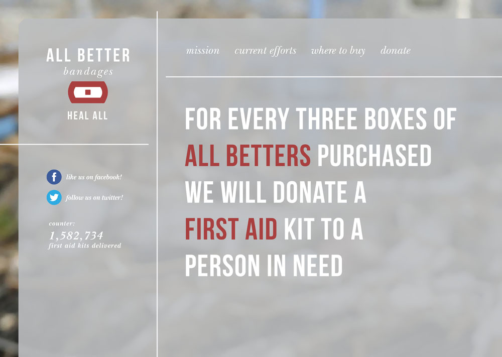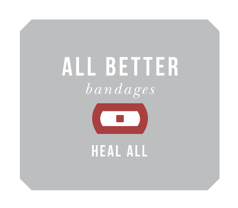 A brand identity and advertising campaign for a bandage company with a cause, All Better Bandages. It’s mission: “For every three boxes of All Betters purchased we will donate a first aid kit to a person in need.”