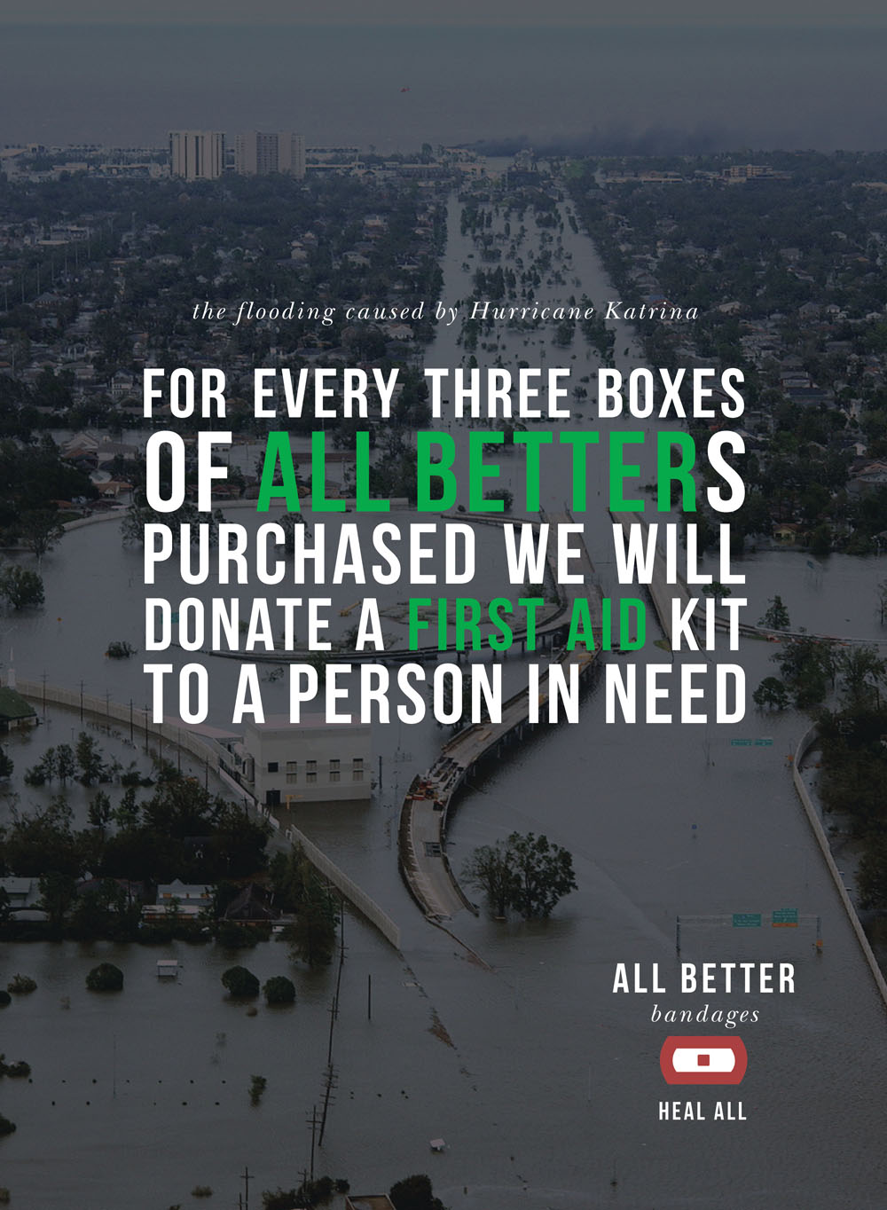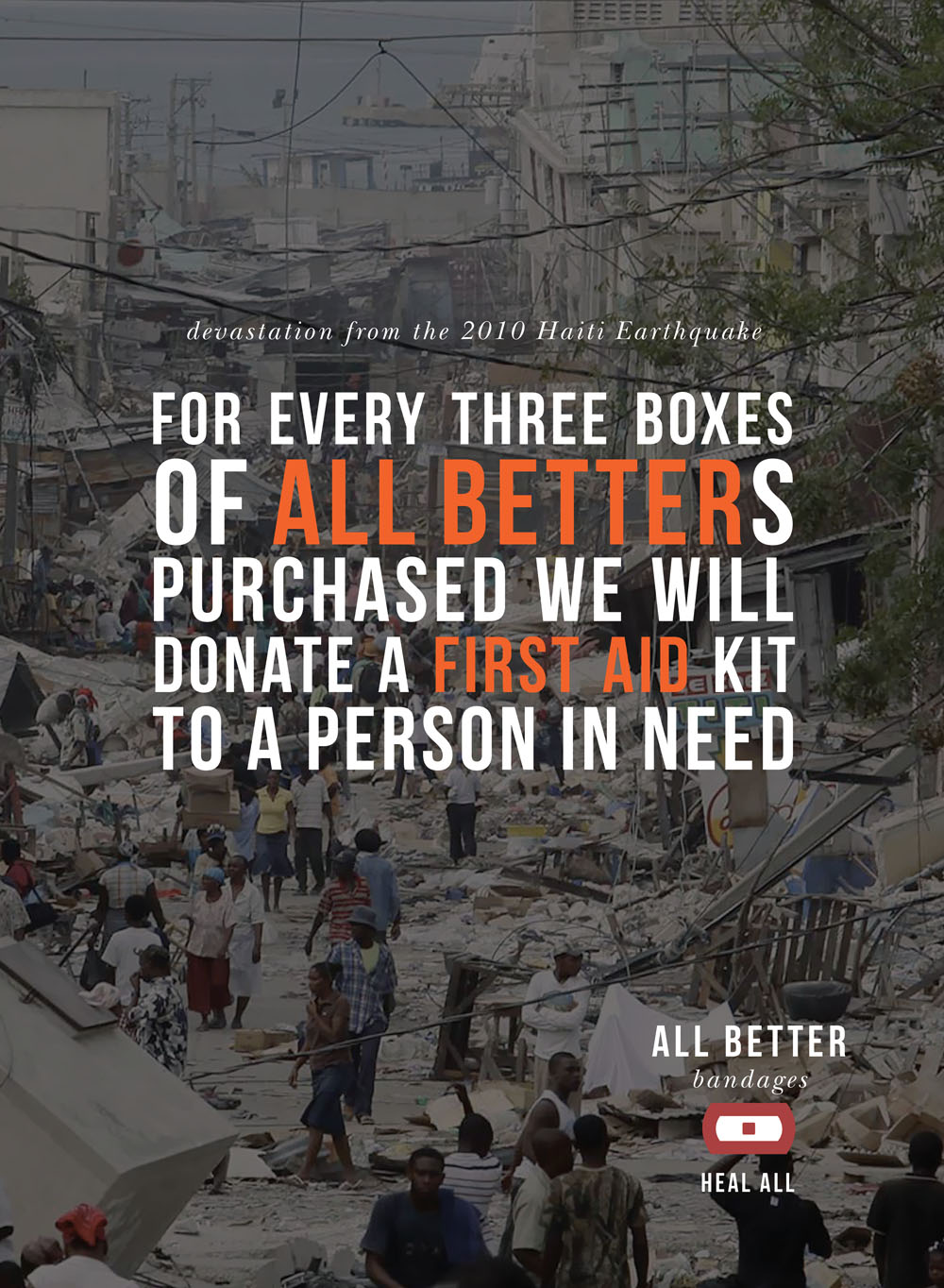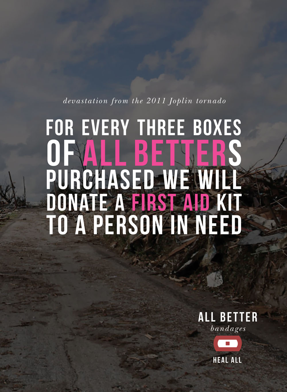 A brand identity and advertising campaign for a bandage company with a cause, All Better Bandages. It’s mission: “For every three boxes of All Betters purchased we will donate a first aid kit to a person in need.”