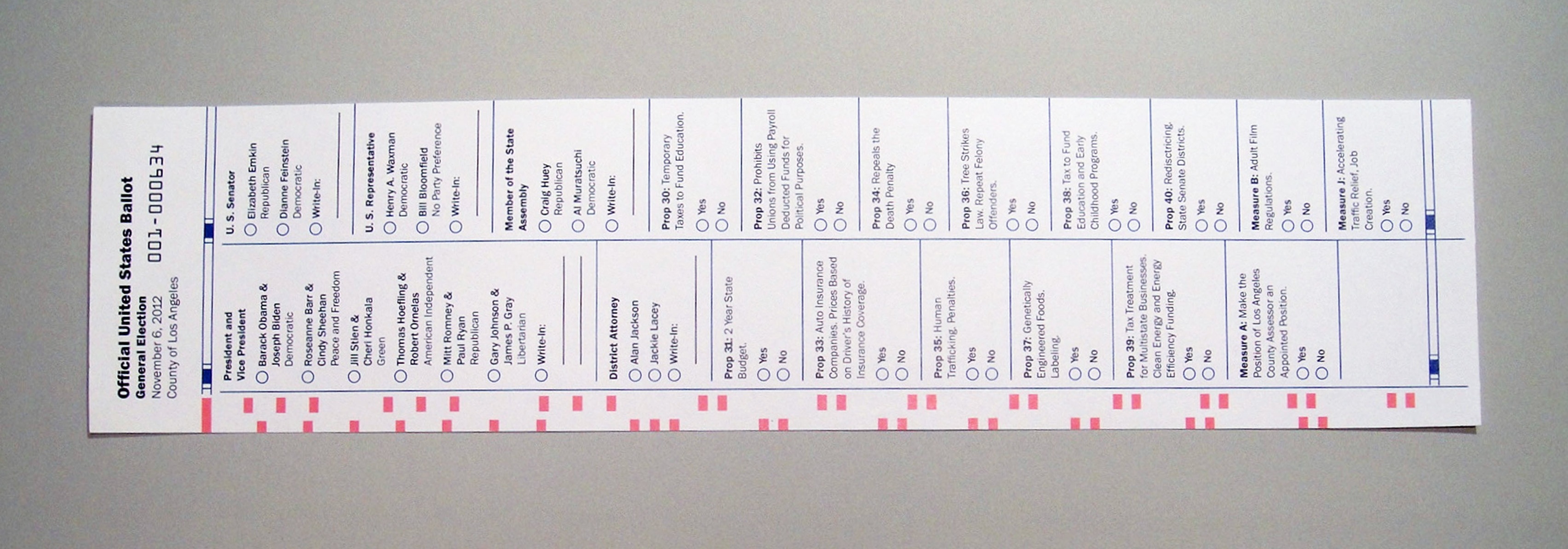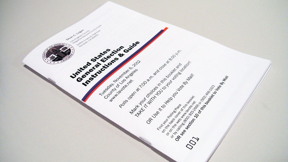 The end result was a long thin ballot that could be printed on a roll of paper and cut to size as it prints. This method allows each area to have a ballot as long or as short as necessary.I made sure the names of the candidates and the descriptions of the propositions and ballot measures could be printed directly on the ballot. This way if an election guide is lost or forgotten, citizens still know who/what their voting for when they’re at the polls. The ballot and its materials are set in an all American typeface, Franklin Gothic, and use a red, white and blue color scheme. Lastly, the ballot is scan-able so votes can be counted easily.